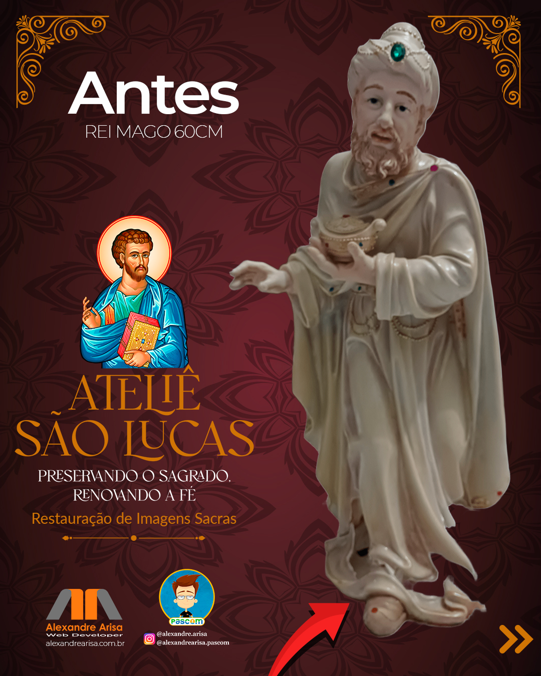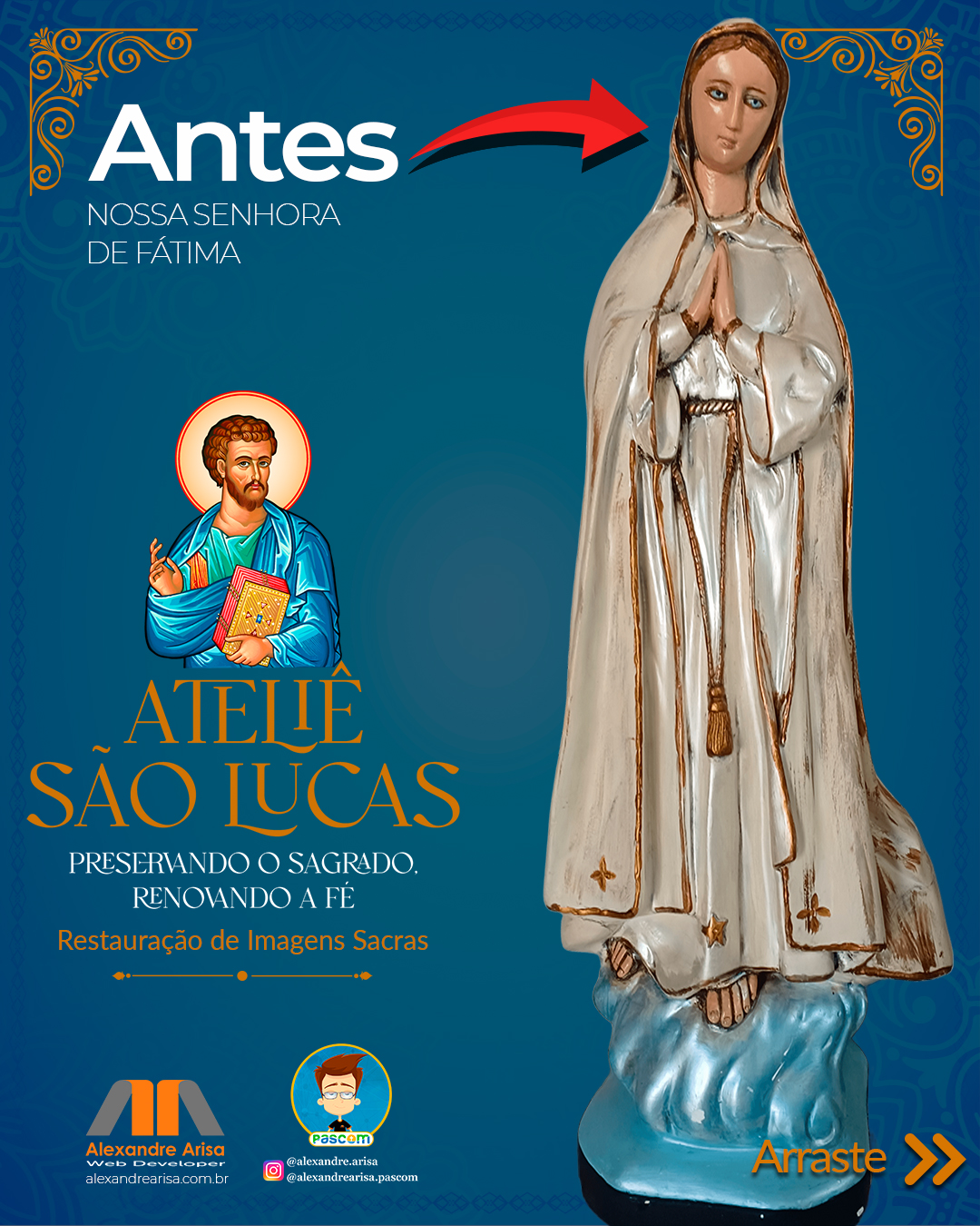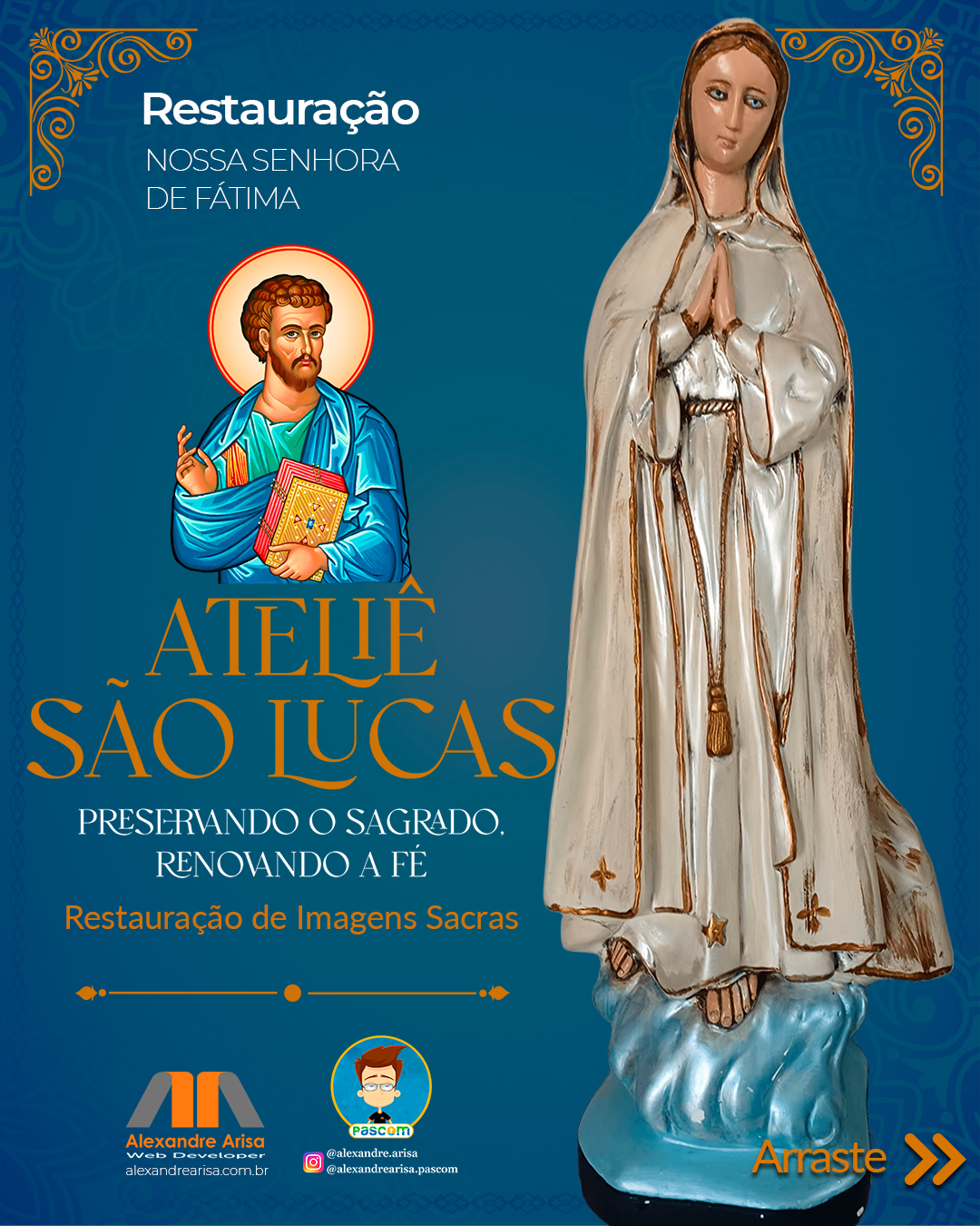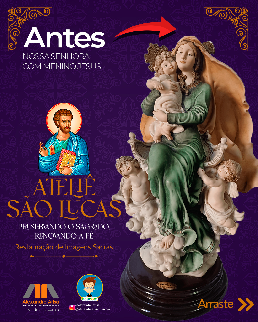 Inspirado na devoção e no legado de São Lucas, padroeiro dos artistas, o Ateliê São Lucas dedica-se à preservação e recuperação de obras sacras com excelência técnica e profundo respeito ao patrimônio religioso. Nosso trabalho une conhecimento especializado em técnicas tradicionais de restauração com sensibilidade artística, garantindo que cada peça conserve sua autenticidade histórica e espiritual.