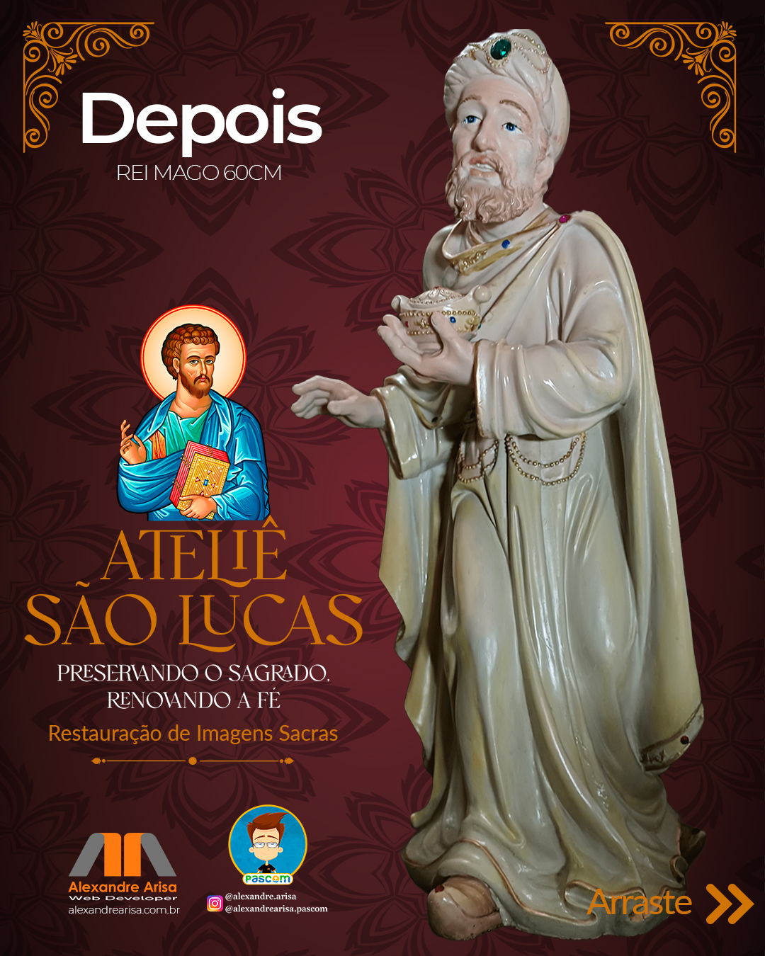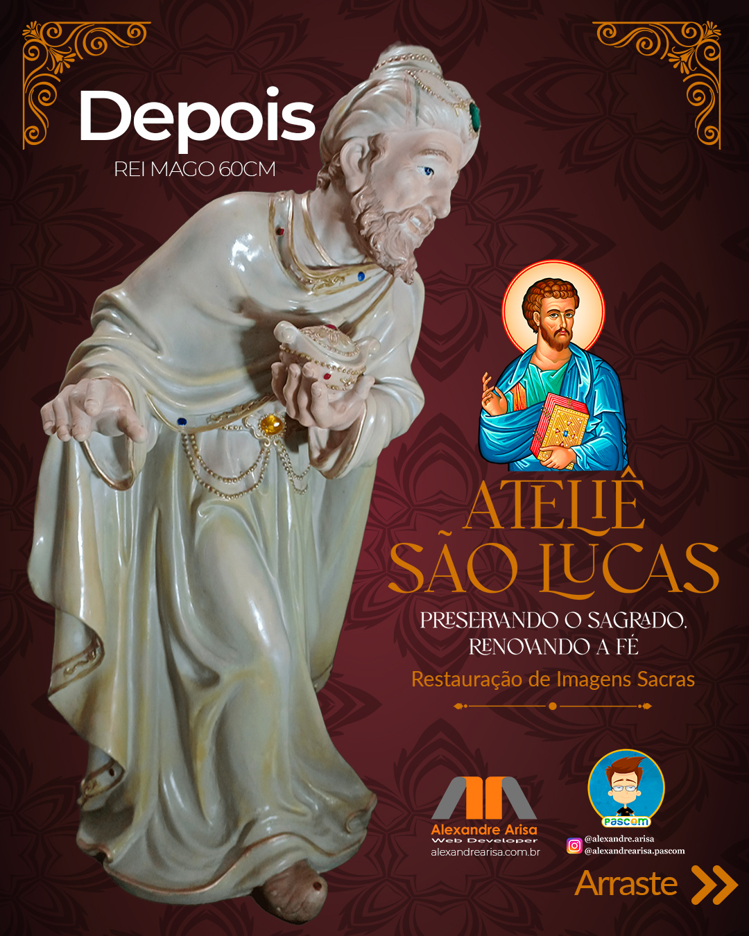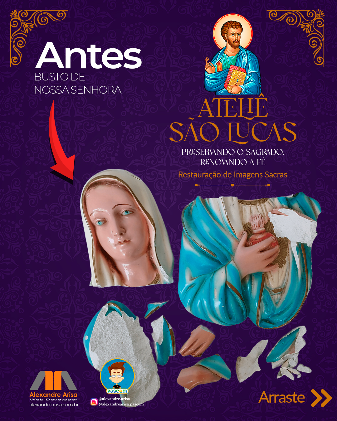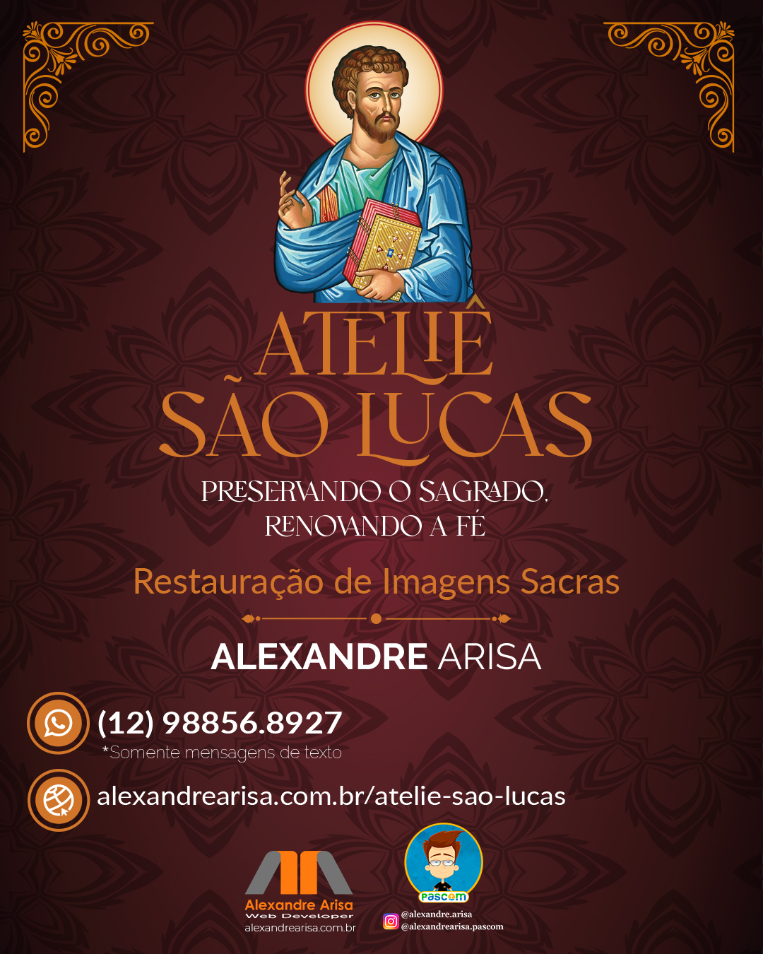 Alexandre Arisa, criador do Ateliê São Lucas – Restauração de Artes Sacras, um brasileiro apaixonado por Arte Sacra, começou a pintar imagens sacras aos 15 anos para ajudar na paróquia em que participava.