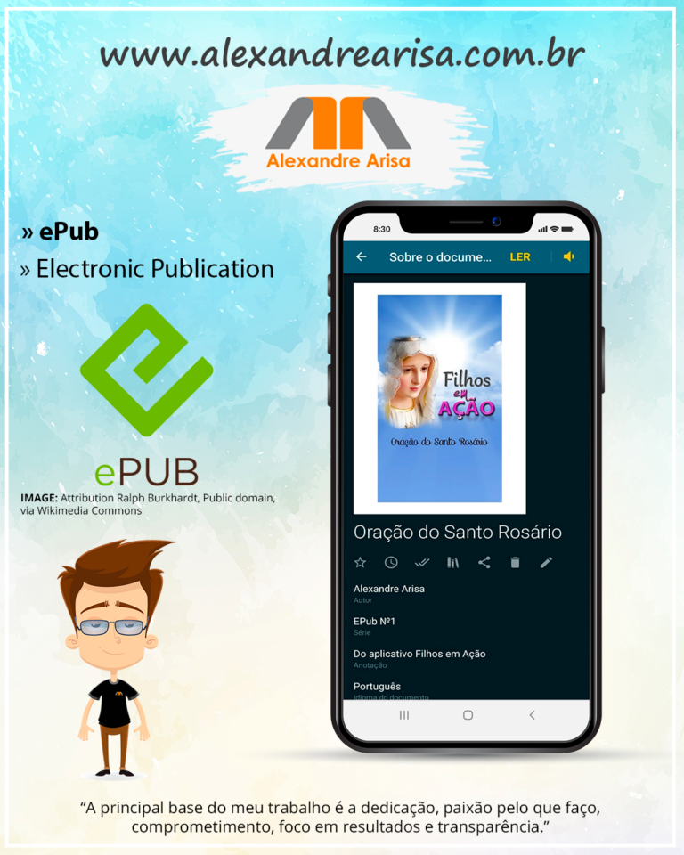 EPUB é livre e aberto para com dispositivos de leitura, em geral, e foi criado pelo IDPF (International Digital Publishing Forum – Fórum Internacional de Publicação Digital). Útil para sistemas como CICOM, por exemplo. Os arquivos têm a extensão .epub.